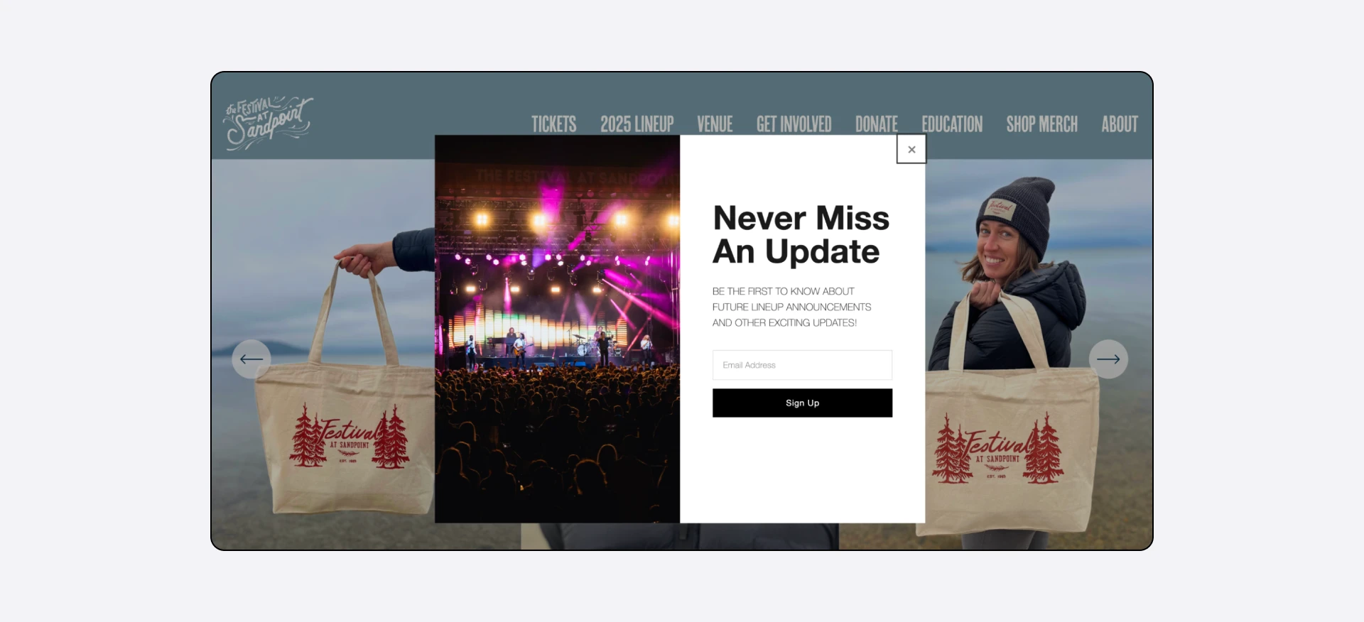 First is letting people sign up to hear band announcements. She promotes this offer on social media using a link in bio page, and on the Festival at Sandpoint website using a pop-up.