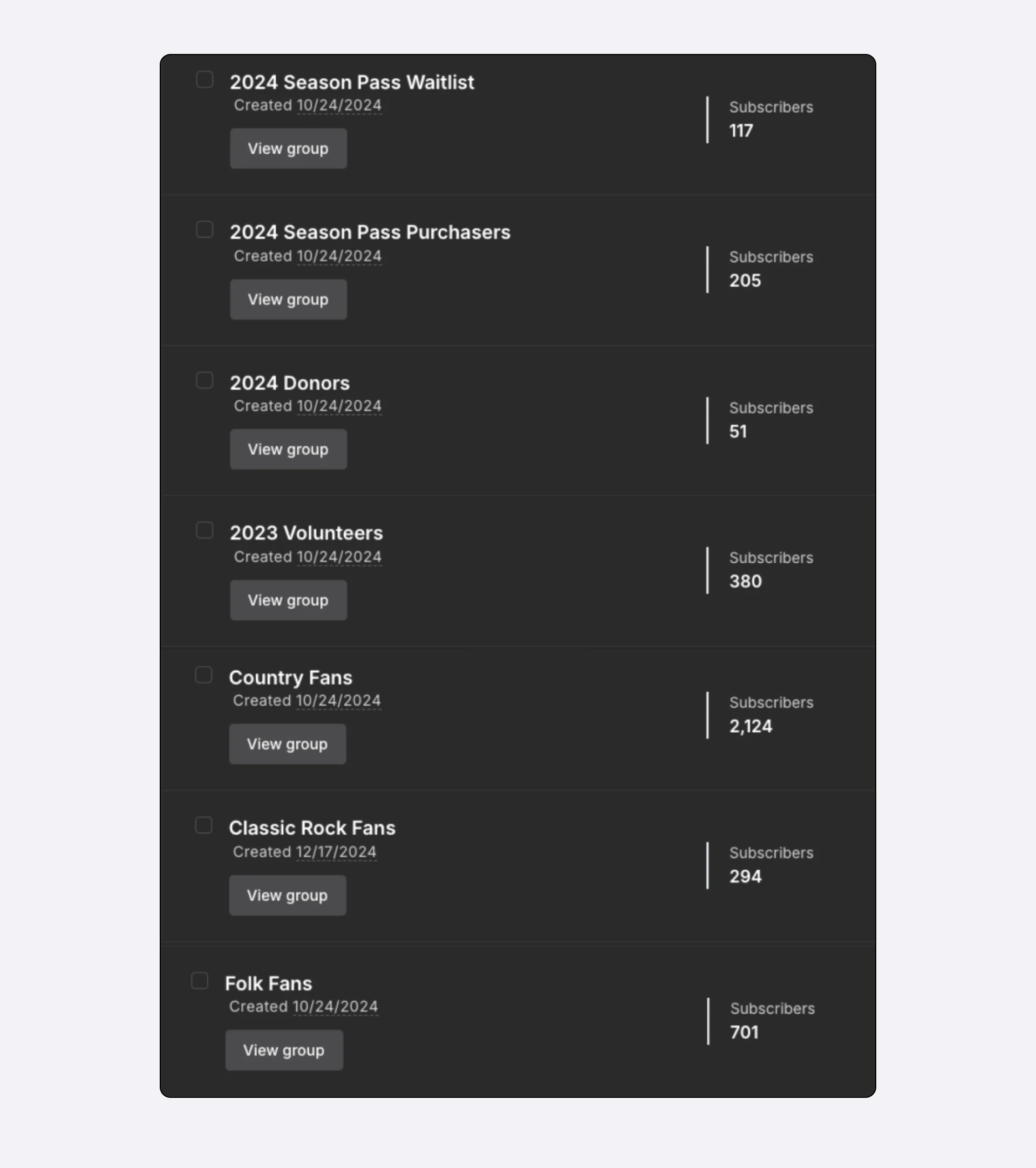 I love my groups! I have groups for people who purchase each year. And I organize them by the genre of the show they attended so we can send relevant promotions. Targeting campaigns increases open rates because people receive content they are interested in.