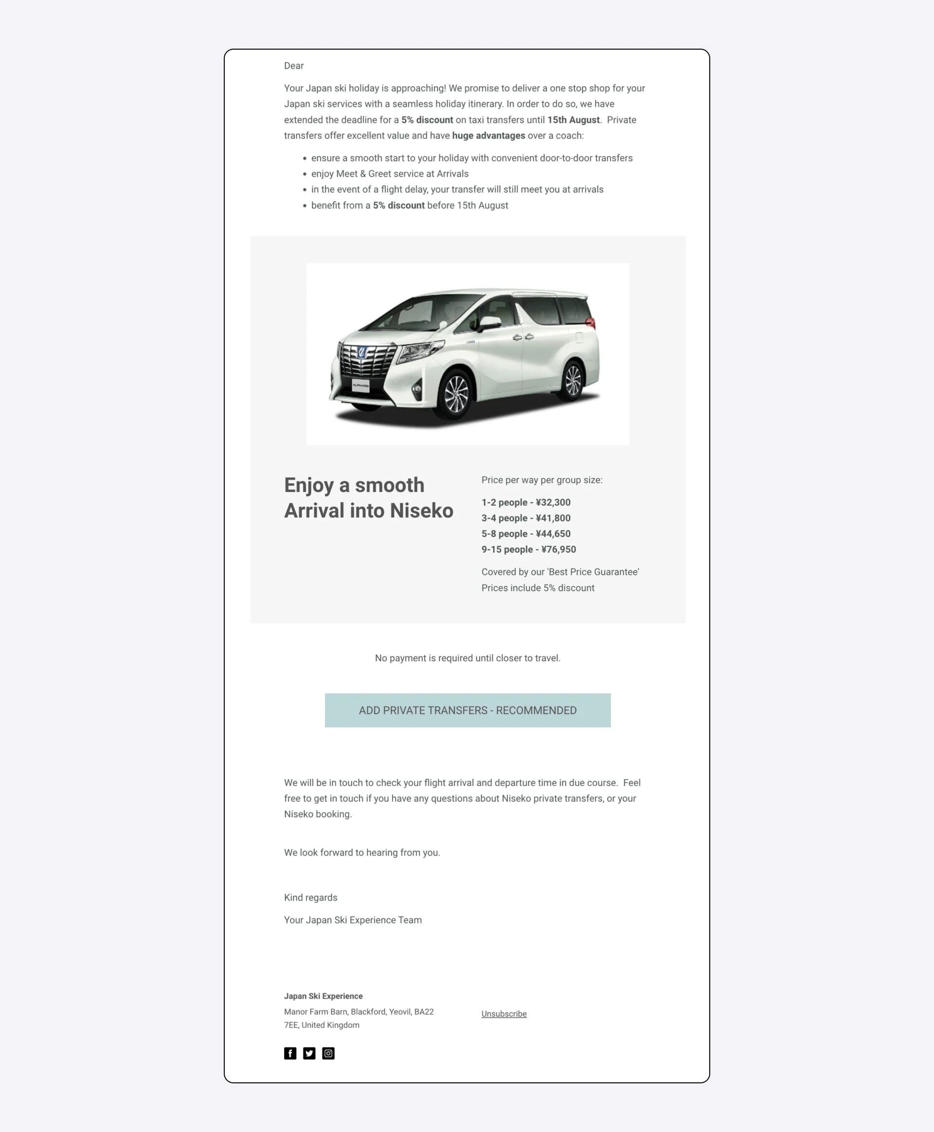 Lindsay uses email segmentation to identify people who have already made a booking and then promote related packages to them, such as airport transfers or lift passes.
