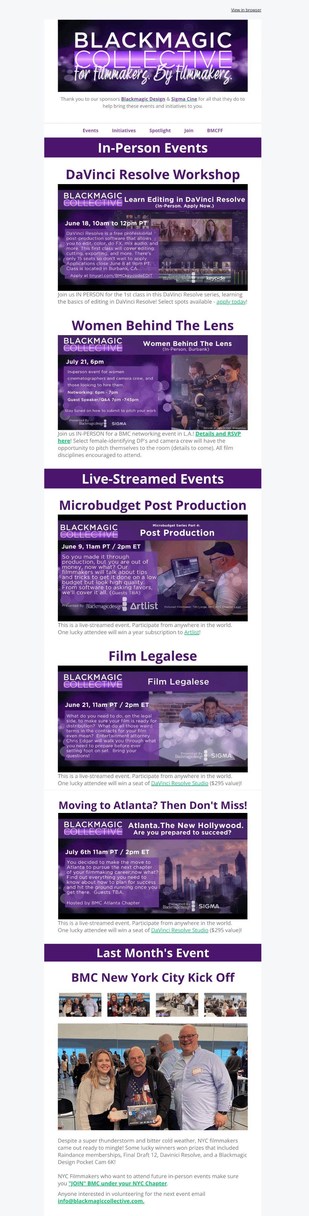 Black Magic Collective shares their upcoming events, splitting them into in-person and live-streamed categories. They also share a photo and update about their previous event, making the email more engaging and keeping subscribers in the loop.