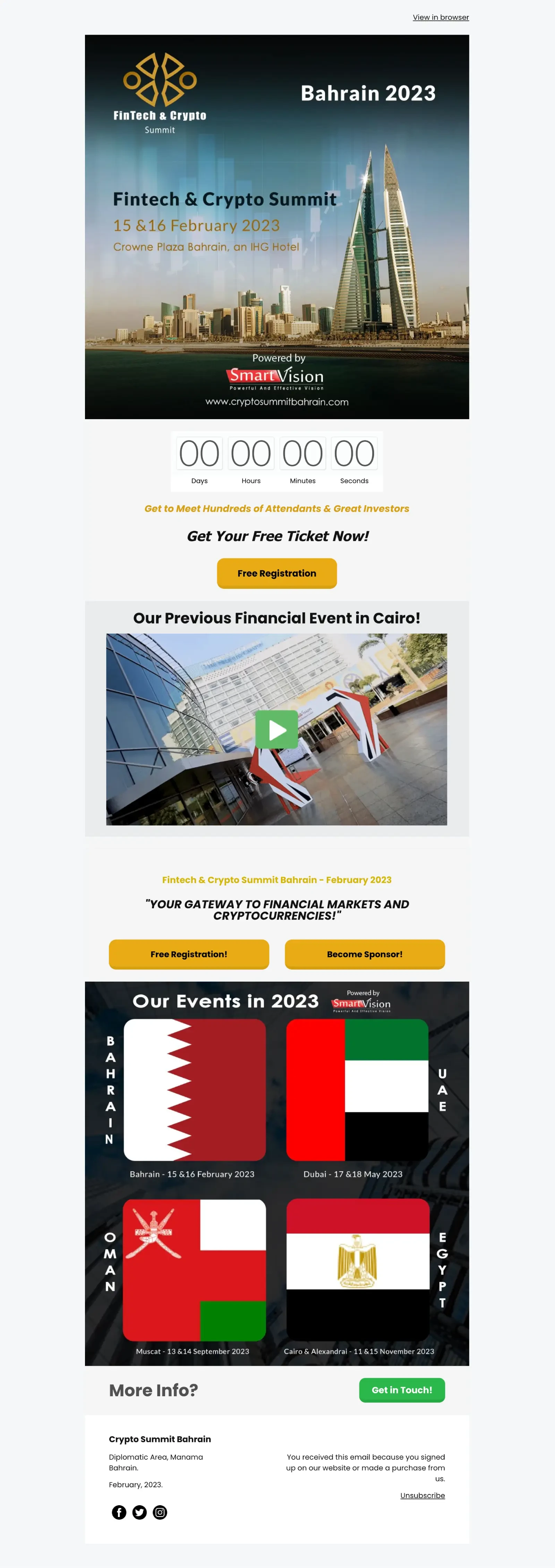 In this example, Crypto Summit Bahrain highlights the important information about their event in the image header of the email. They also include a countdown and a video of their previous event to help drum up excitement and anticipation.