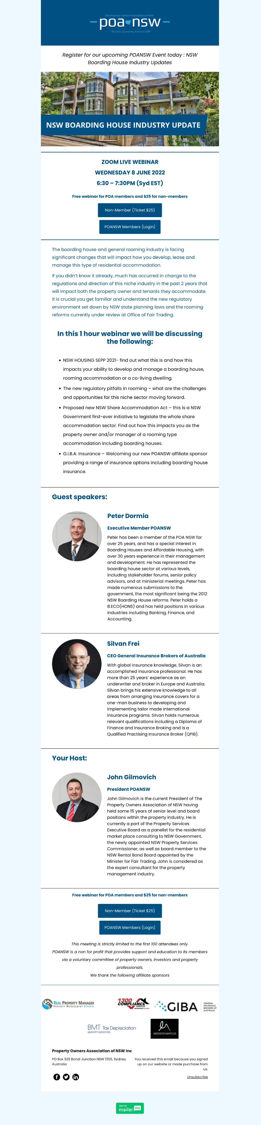 The Property Owners Association of New South Wales has a very well-designed event invitation email for their webinars that makes it super easy to access all important information as well as register for the event.