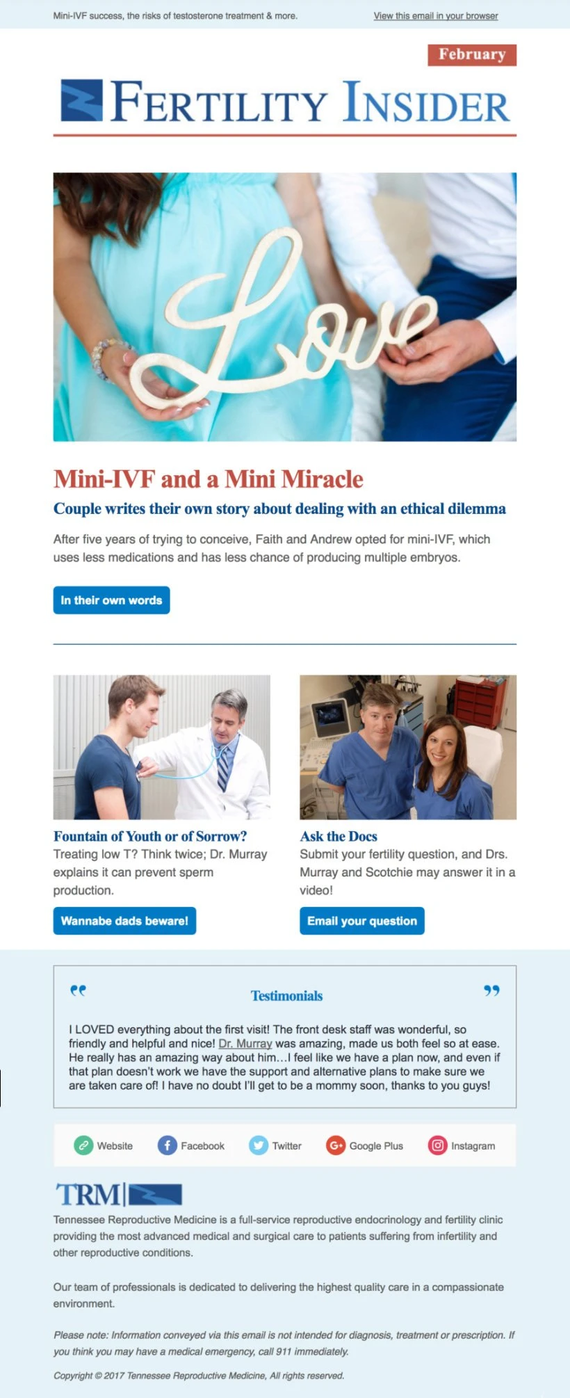 Tennessee Reproductive Medicine created this newsletter that features a couple’s journey through IVF, along with educational content and a patient testimonial. For a best-case scenario, this health newsletter would be segmented to target prospective patients dealing with the same issues.