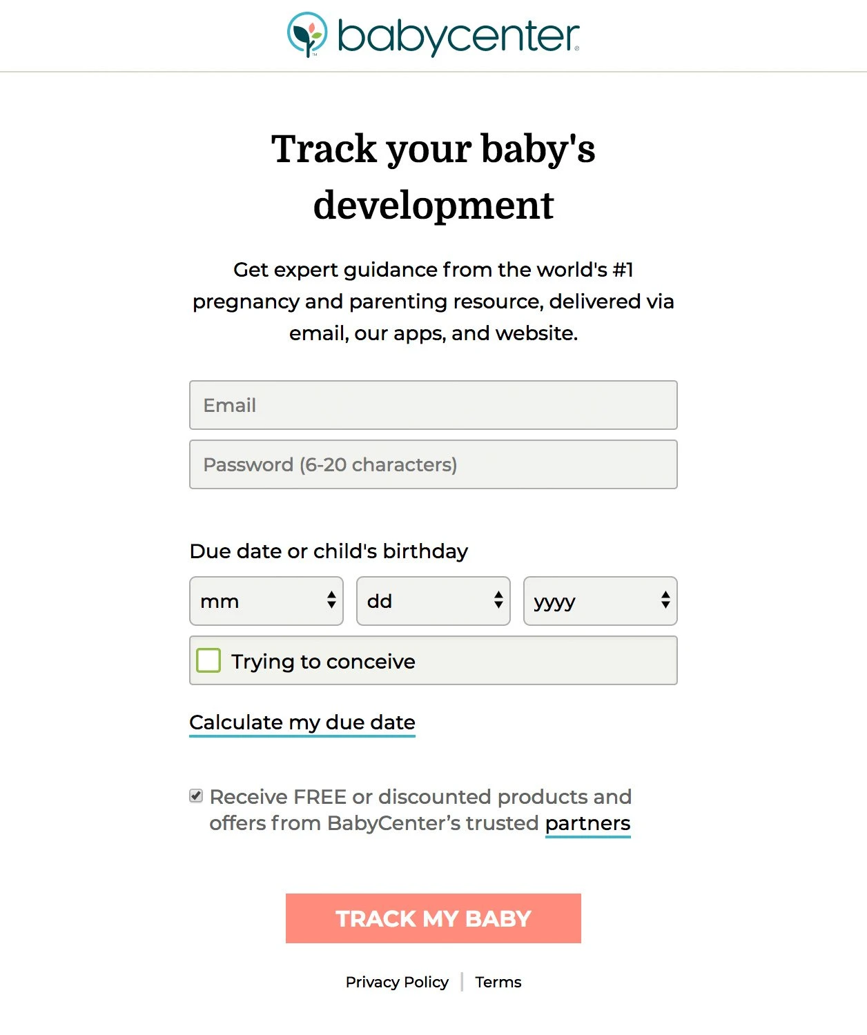 Here is a BabyCenter landing page that allows you to calculate your baby’s due date. Many aspiring or again-to-be parents will find this information very valuable, making the decision to signup easy.
