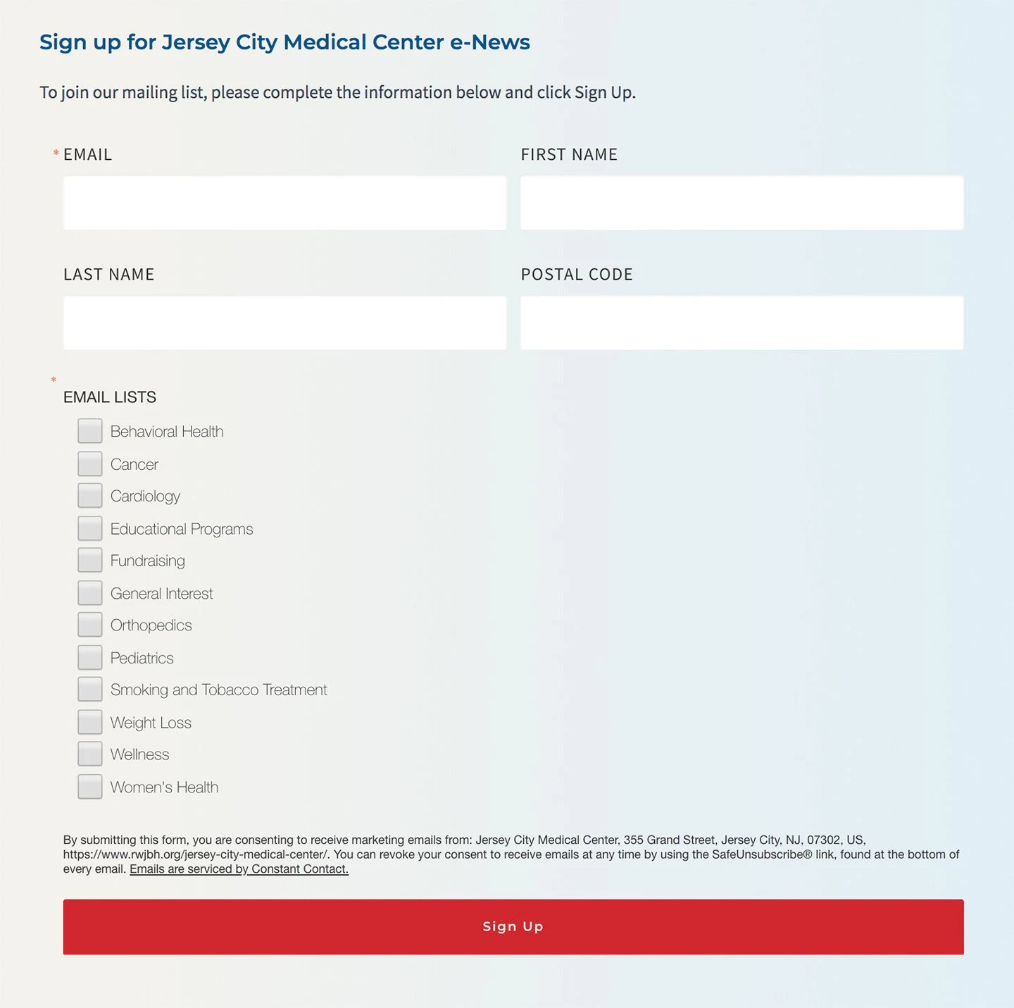 Here’s an example from Jersey City Medical. You can see under the name fields that there are checkboxes with various topics. Each subscriber chooses only the ones they want to know more about. This is a powerful way to empower your subscribers to receive only what they want!