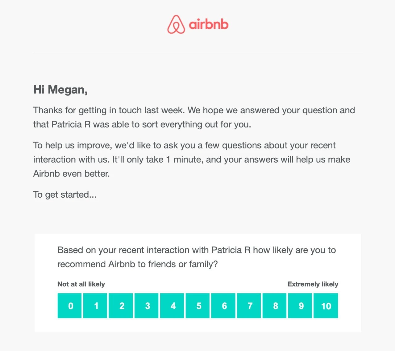 Here's an email from Airbnb that asks subscribers how they can improve their customer support. All the reader needs to do is click the number that reflects the likeliness.