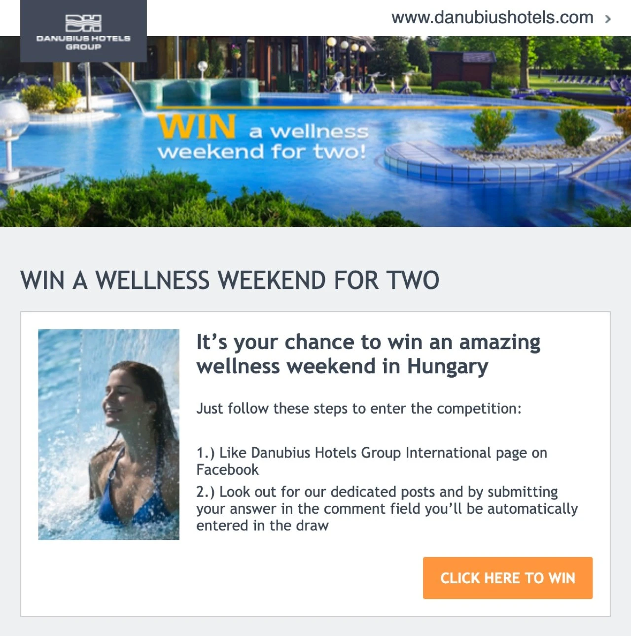 Or, host a contest to gather more social followers. Hotel Danubius gives away a wellness weekend in Hungary. All that their readers need to do to enter is "like" the hotel on Facebook.