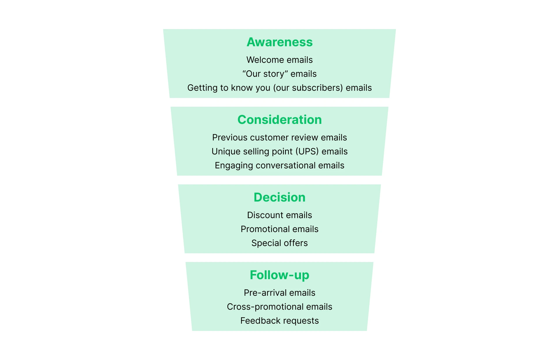 What type of email you send to your subscribers should depend on which stage of the customer journey they’re on. For example, emails with discount offers in the subject line should only be sent to subscribers in the decision phase. Whereas review requests and pre-arrival emails belong in the follow-up phase.