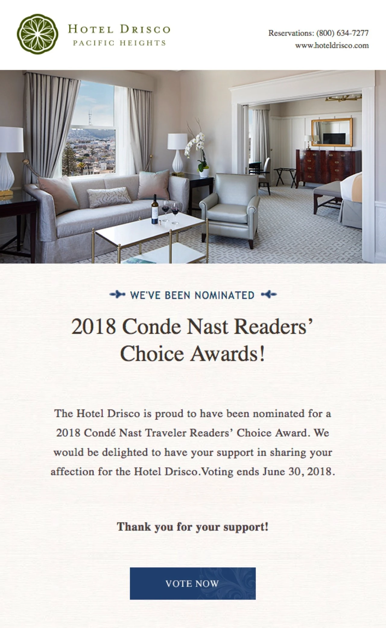 Sure they’re asking their readers for a favor, but it also shows that the hotel is worthy of an award nomination.