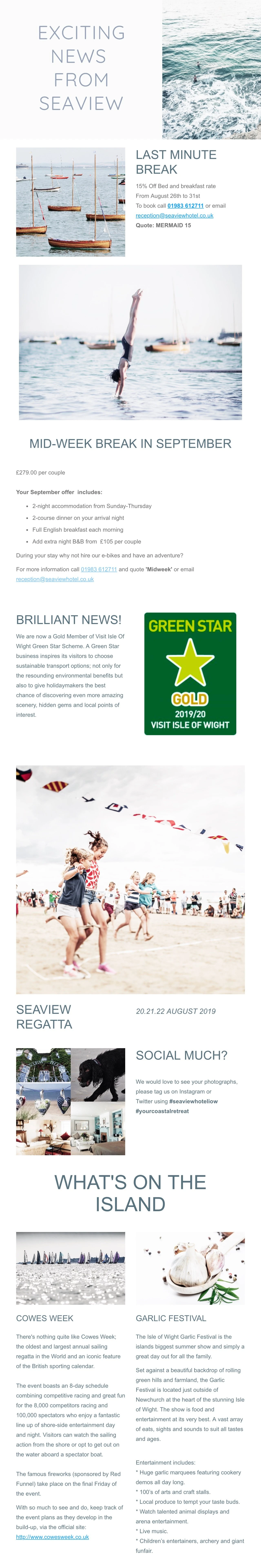We love the design and email content from the Seaview Hotel. The British hotel does a great job of treating the customer to last-minute getaway offers, as well as informing the reader about local events and hotel news.