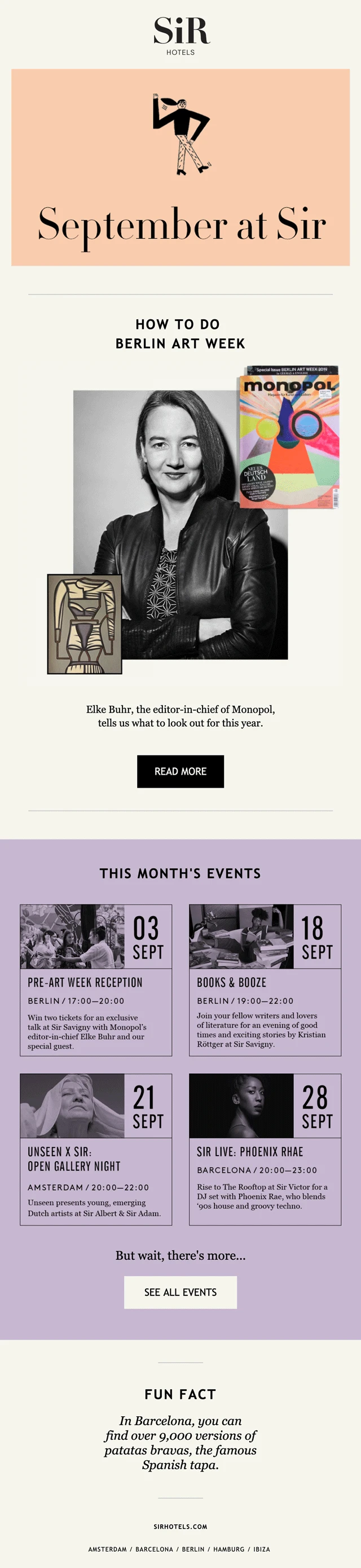 This email from Hotel Sir is not only beautifully designed (we love the pastel newsletter colors), it’s also informative and useful for hotel guests and regular visitors.