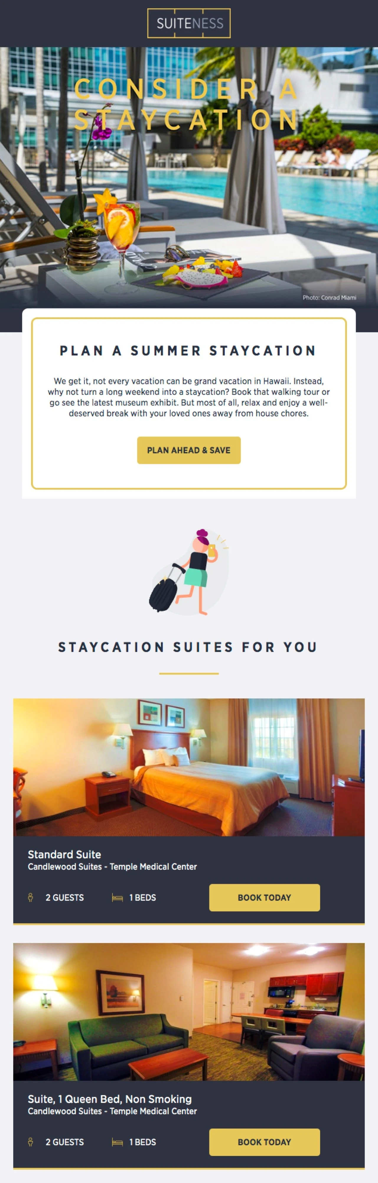 The first line of the email says “We get it, not every vacation can be a grand vacation in Hawaii.” Imagine if this email was targeted at people who just visited Hawaii, probably spent a few bucks and were now suggested to plan a summer staycation—current, helpful and relevant!