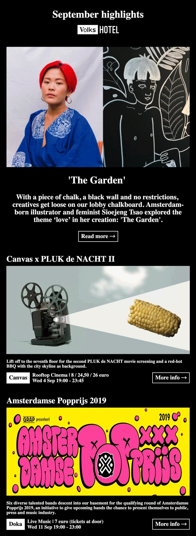 Their newsletters look like a high-quality piece of art, which makes sense, as they host a lot of art-related events. In the newsletter below, they announce their September highlights.