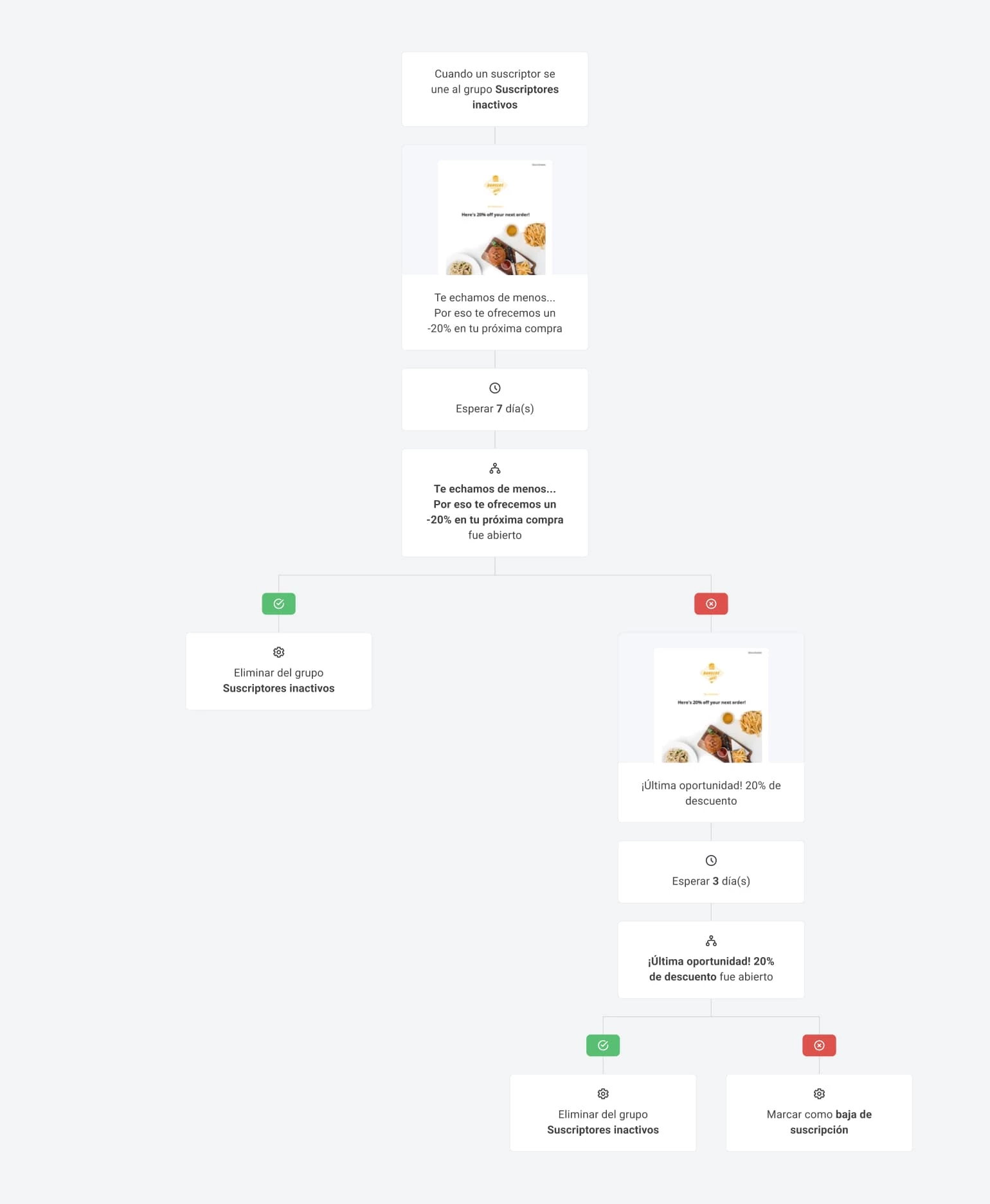Si un suscriptor inactivo no ha abierto o hecho clic en el enlace del código de descuento en el primer correo electrónico después de unos días, puedes enviar un segundo correo electrónico para intentar captar su atención una vez más. Puedes recrear el primer correo electrónico u ofrecer un incentivo diferente para volver a participar. Aquellos que interactuaron con la campaña de re-engagement o reactivación pueden ser eliminados del grupo de suscriptores inactivos.