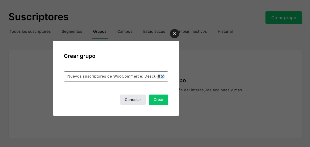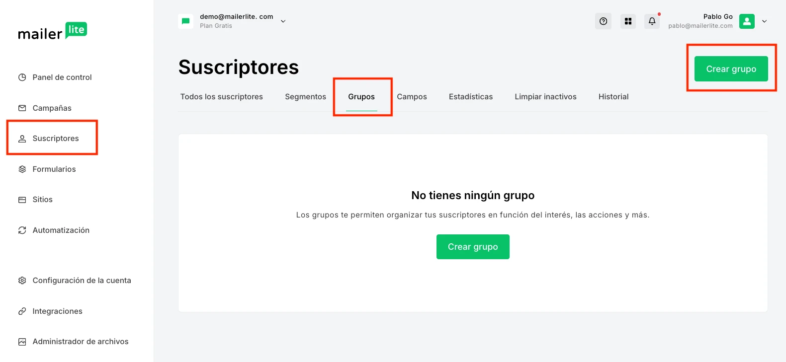 a) Crea un grupo al que añadir a tus suscriptores dirigiéndote a Suscriptores > Grupos y haciendo clic en Crear grupo.