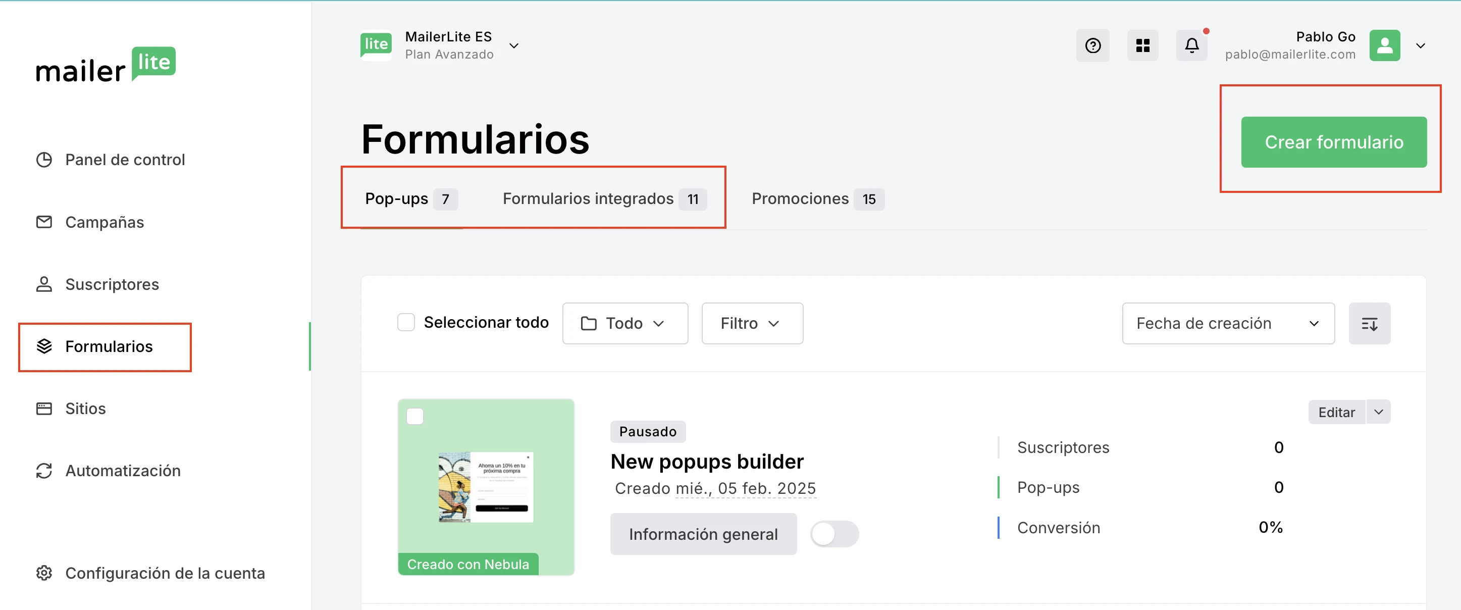 a) Ve a Formularios y selecciona Pop-up o Formularios integrados. A continuación, haz clic en el botón Crear.