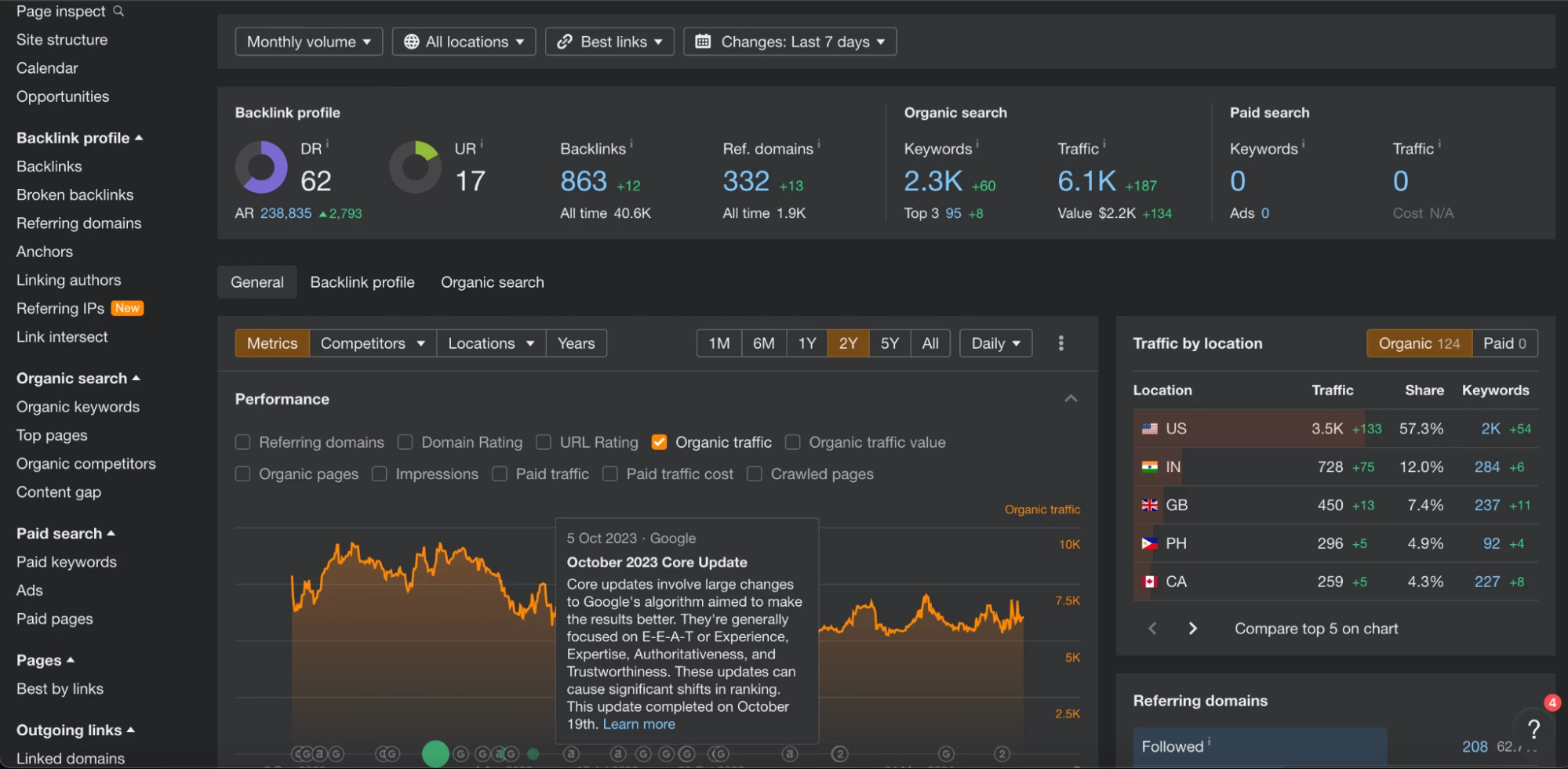 Ahrefs es una herramienta SEO con muchas funciones que puedes aprovechar para tu estrategia SEO, como rastrear las clasificaciones de tu sitio web, investigar a la competencia, encontrar ideas de contenido, auditar tu sitio web y mucho más.