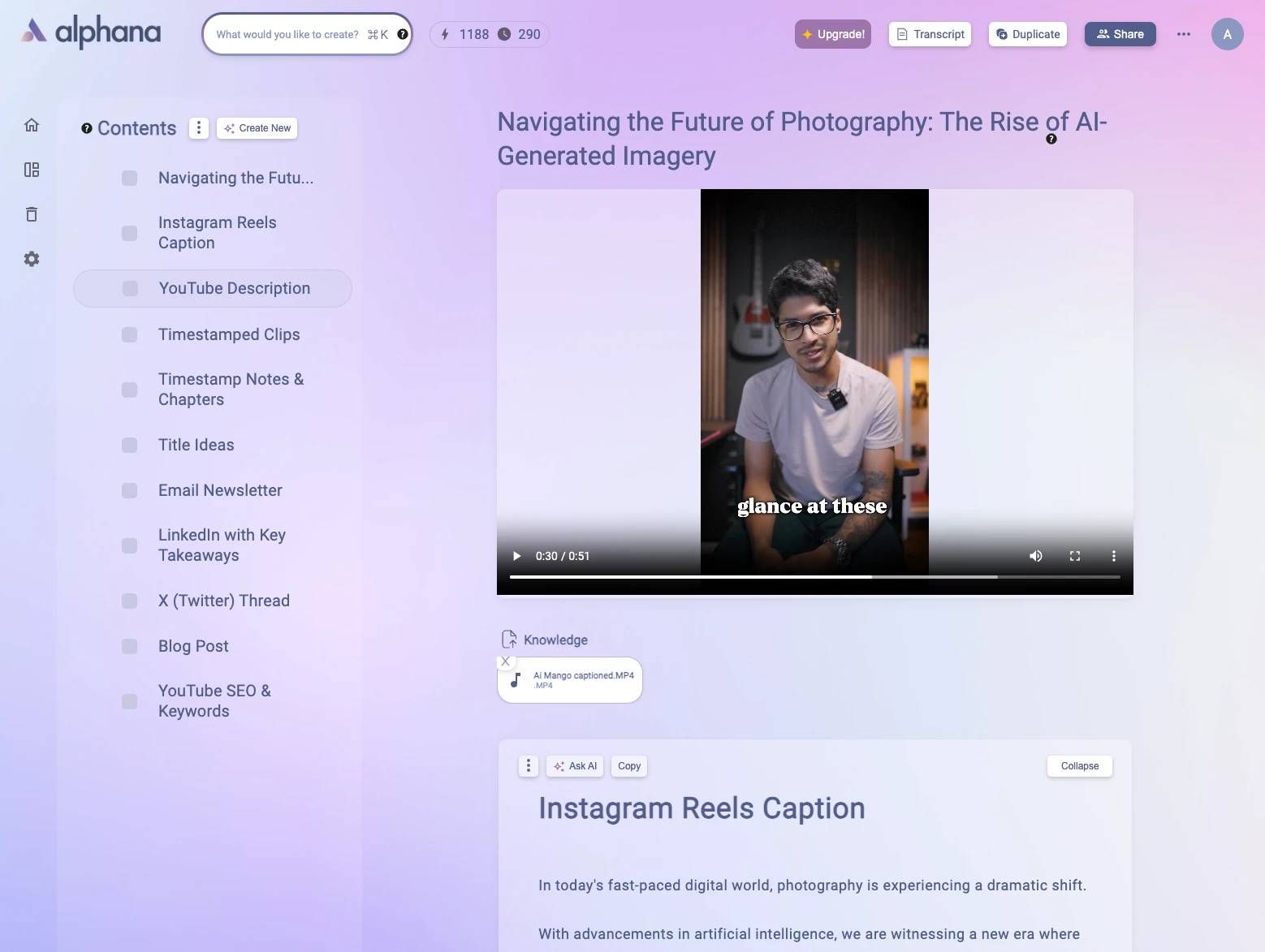 Alphana es un gestor de contenidos con IA que convierte videos, podcasts e ideas en contenidos escritos como resúmenes, entradas de blog, actualizaciones de redes sociales y materiales de marketing.