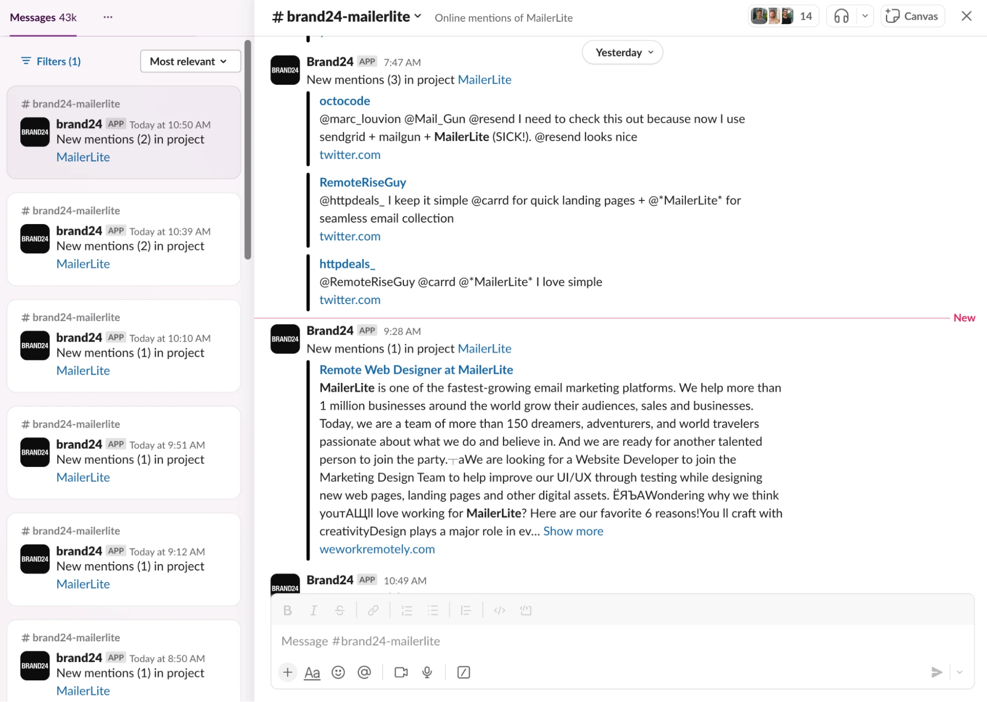 Tenemos una integración con Slack que nos envía todas las alertas directamente a nosotros. Poder ver nuestras menciones en un solo lugar es más fácil que estar comprobando continuamente diferentes plataformas.