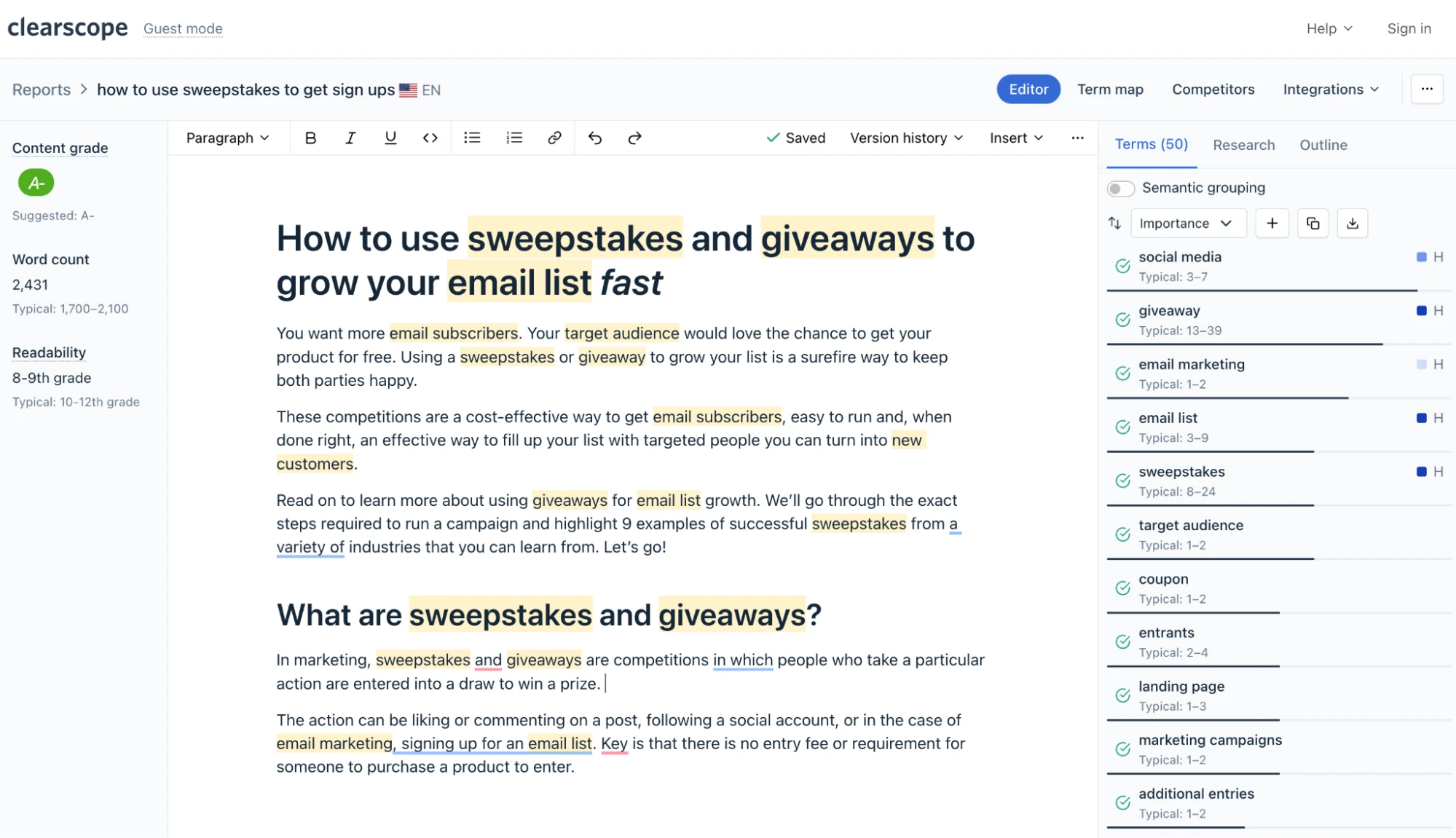 Clearscope también puede analizar tus borradores o el contenido existente para destacar cómo puedes optimizar mejor el contenido.