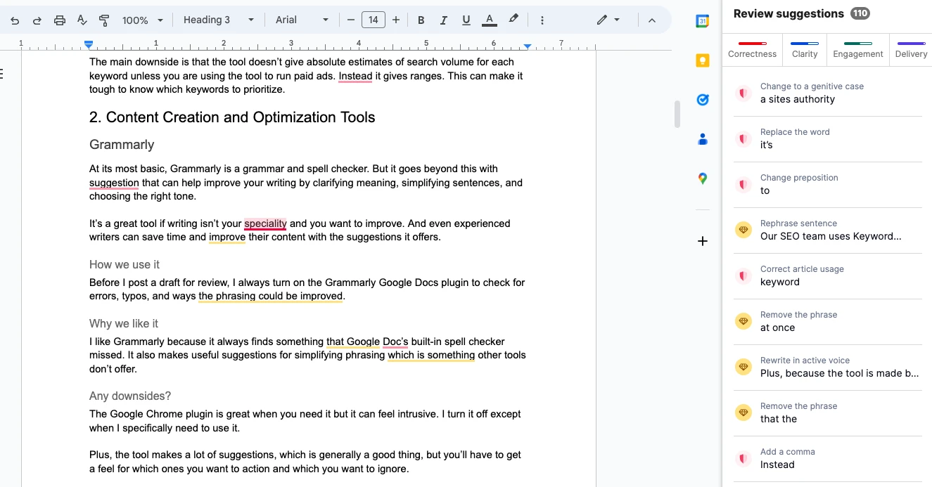 Grammarly siempre encuentra un error o sugerencia que el corrector ortográfico integrado de Google Docs no ha detectado. También hace sugerencias útiles para simplificar la redacción. Estas funciones reducen en gran medida las posibilidades de que publique contenido con un error, por pequeño que sea. 😉