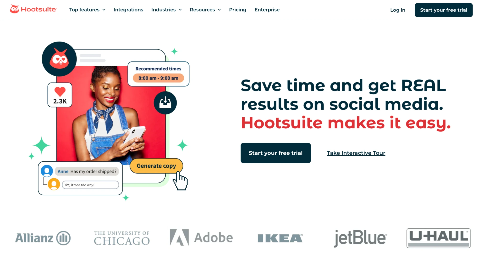 Hootsuite es una plataforma de gestión de redes sociales que permite a los usuarios programar publicaciones, supervisar la actividad en las redes sociales y analizar el rendimiento en múltiples redes sociales.
