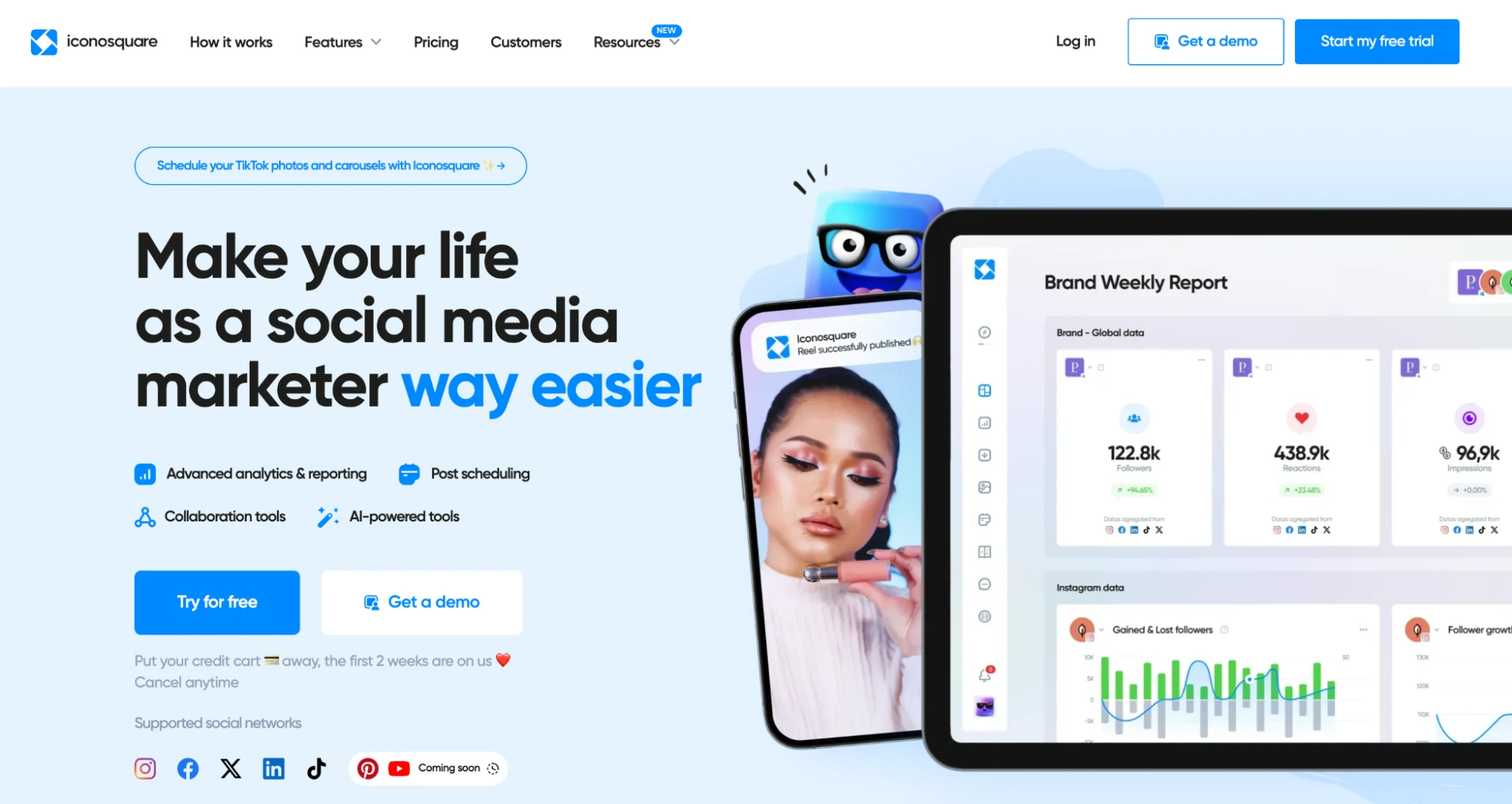 Iconosquare es una herramienta de análisis y gestión de redes sociales. Destaca por sus datos sobre la participación de la audiencia, el rendimiento de las publicaciones y el aumento de seguidores. También tiene funciones de programación que te permiten publicar en varias plataformas simultáneamente.