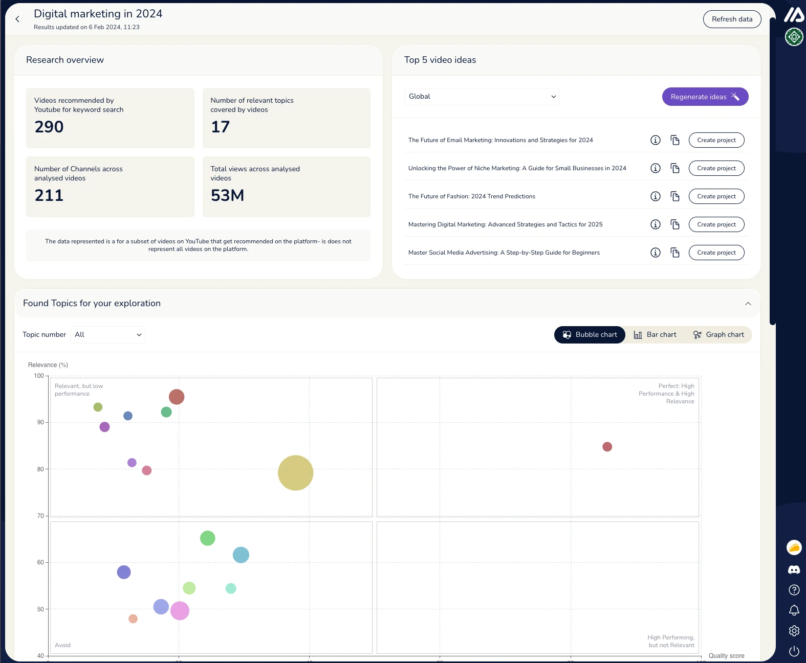 Utilizamos Maekersuite para investigar ideas para video. La herramienta analiza millones de videos de YouTube y proporciona información basada en datos sobre temas de moda y formatos populares.