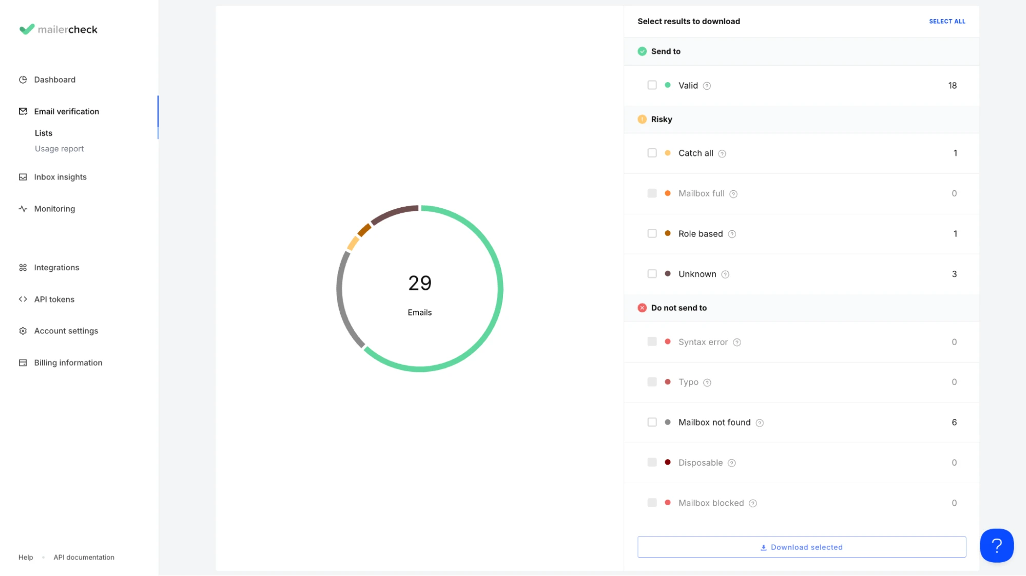 MailerCheck es una herramienta de verificación y validación de correo electrónico que ayuda a las empresas a limpiar y gestionar sus listas de correo electrónico identificando las direcciones de correo electrónico no válidas, de riesgo o inactivas.