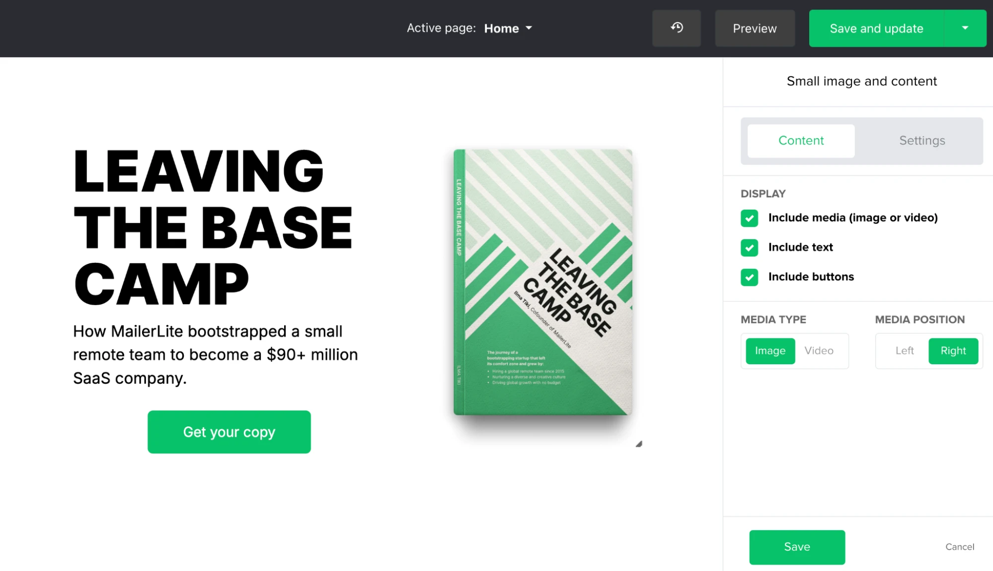 El creador de sitios web y landing pages de MailerLite, también disponible en español, facilita a los equipos de contenidos la creación de páginas web para sus proyectos. Tiene funciones útiles como formularios de suscripción, bloques prediseñados, plantillas de página y herramientas de ecommerce.