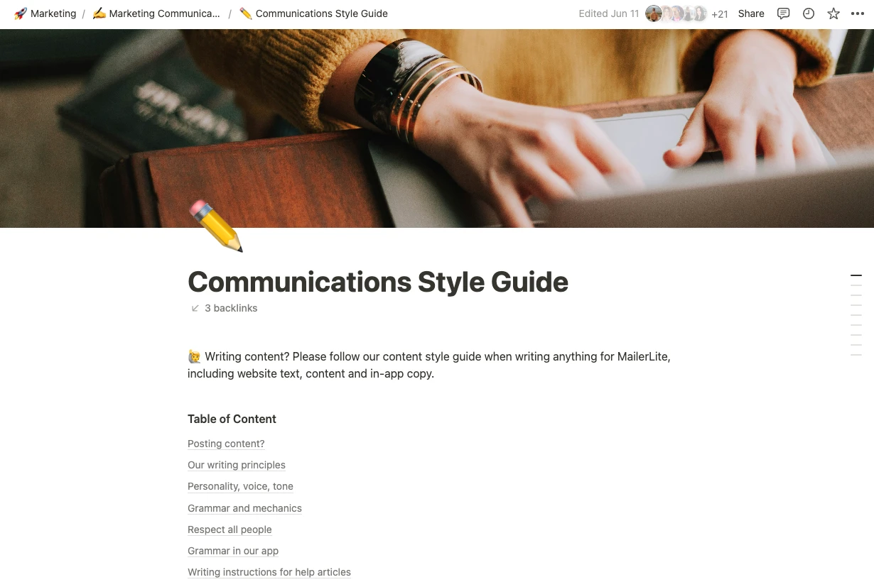 Nuestro equipo de contenidos utilizaba Notion para toda nuestra documentación. Tanto nuestra guía de estilo como el proceso de producción de contenidos estaban alojados en wikis de Notion.