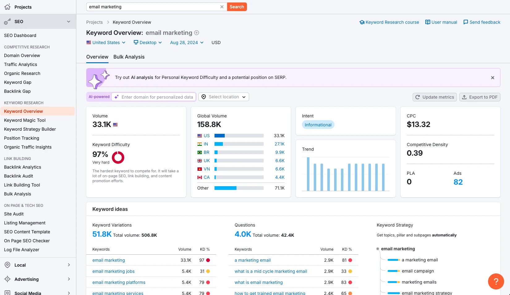Probamos Semrush por muchas de las mismas razones por las que utilizamos Ahrefs: investigación de palabras clave, seguimiento de rangos, investigación de la competencia y supervisión de la salud del sitio.