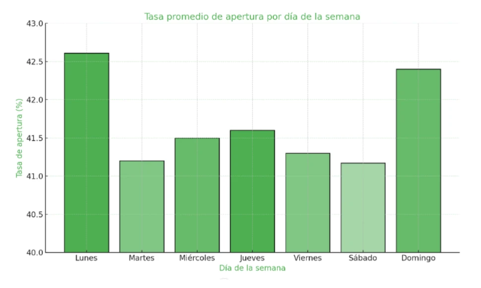 Domingo: Sorprendentemente, este día también presenta una alta tasa promedio de apertura del 42.40%, probablemente porque los usuarios tienen más tiempo libre. Este día es útil para newsletters o contenido de lectura ligera.