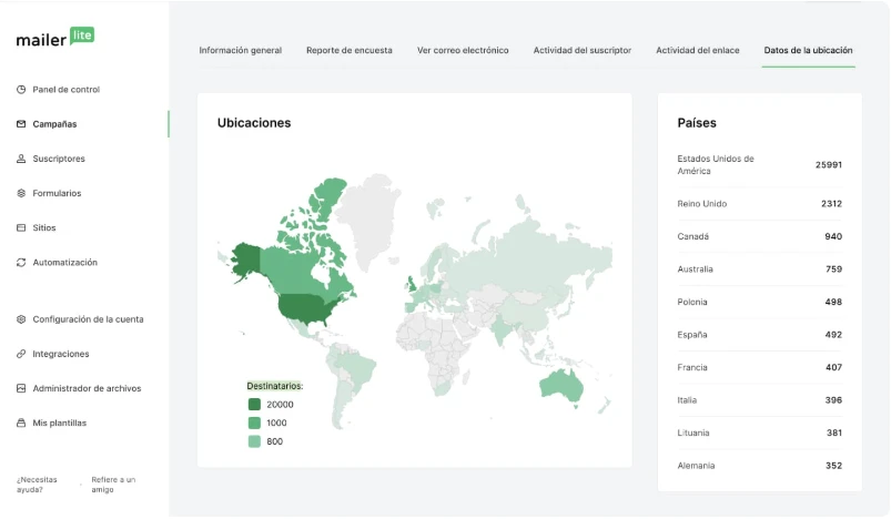 Con MailerLite, puedes verificar tus "aperturas por ubicación" para comprender dónde se encuentran tus suscriptores. Cuando optimizar los tiempo de envío de tus correos electrónicos, no corres el riesgo de entregar newsletters a tu audiencia internacional en horas de baja apertura.