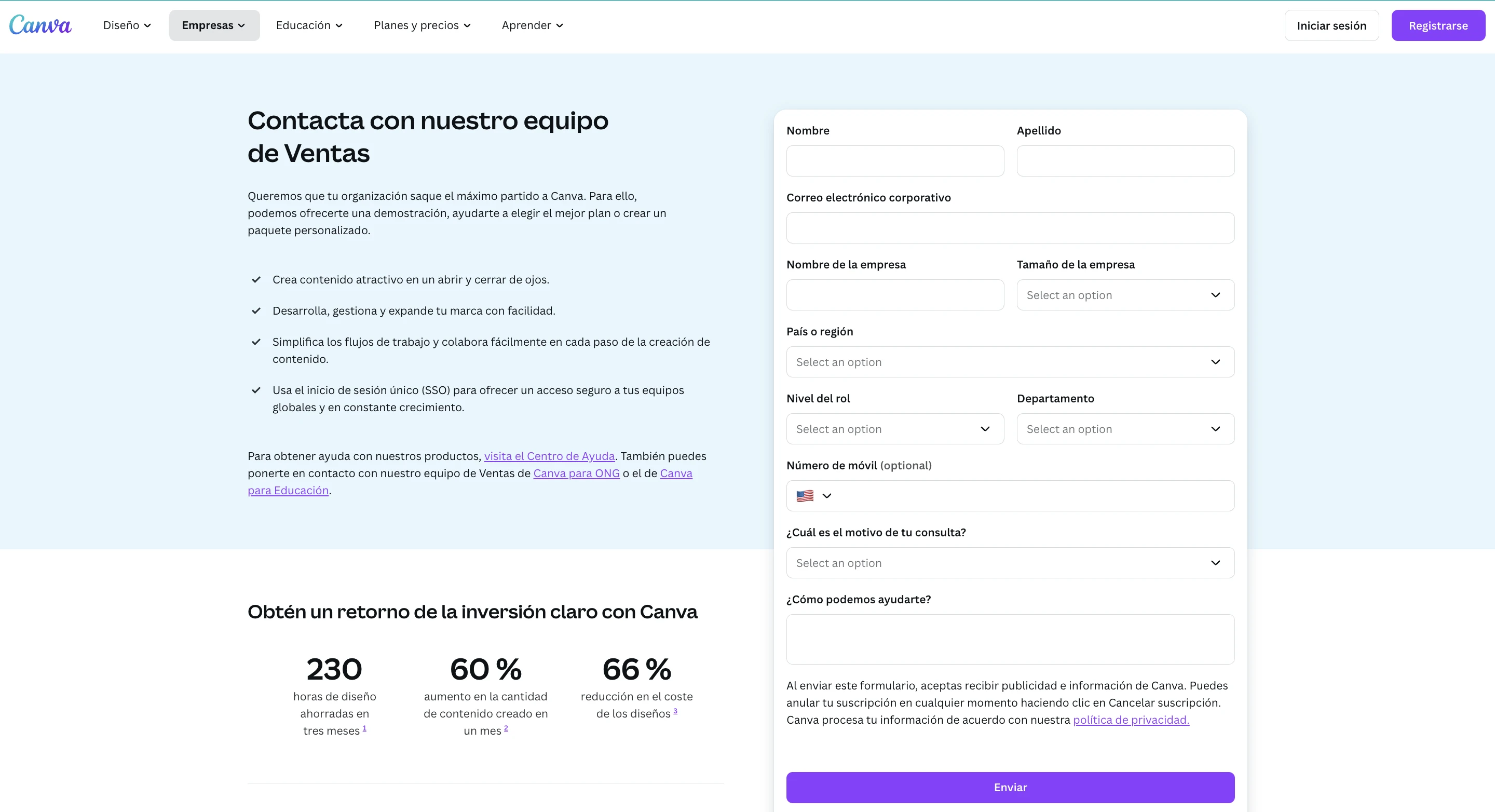 Puedes ver su formulario en https://www.canva.com/es_es/contacto-ventas/