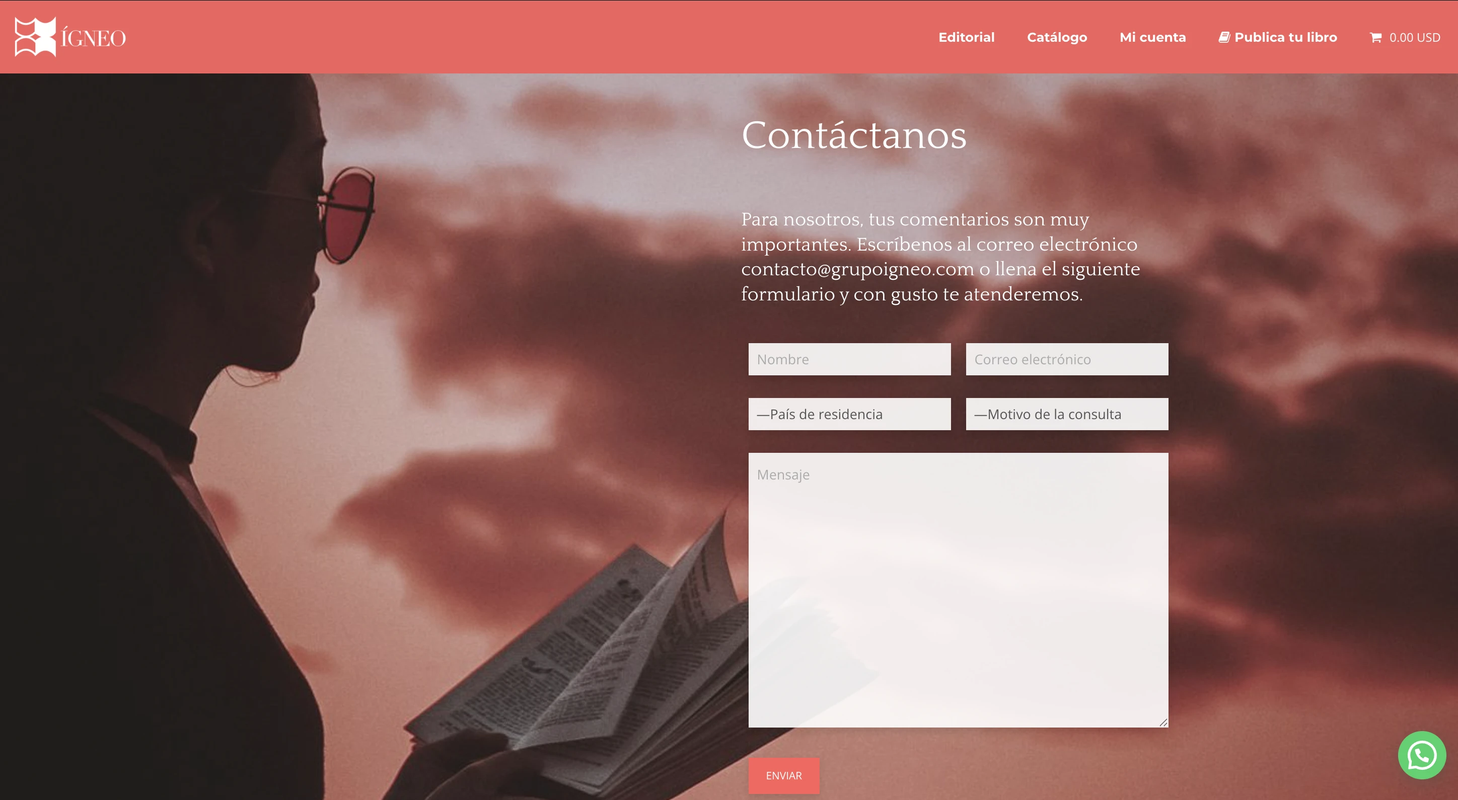 Grupo Ígneo es una editorial independiente que ofrece un formulario de contacto claro y accesible. En su página de contacto, los usuarios pueden completar campos básicos como nombre, correo electrónico y mensaje.