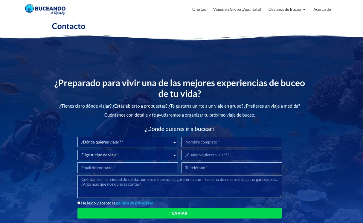 El formulario de Buceando a mares, permite a los usuarios solicitar información y reservar actividades de buceo. Es claro y directo, solicitando la información esencial para gestionar las reservas y consultas de manera eficiente.