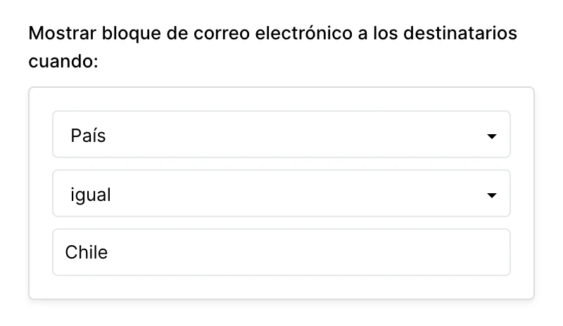 Por ejemplo, puedes elegir mostrar un bloque a personas de un país concreto seleccionando el campo personalizado País, el operador igual y, a continuación, introduciendo el país correspondiente.