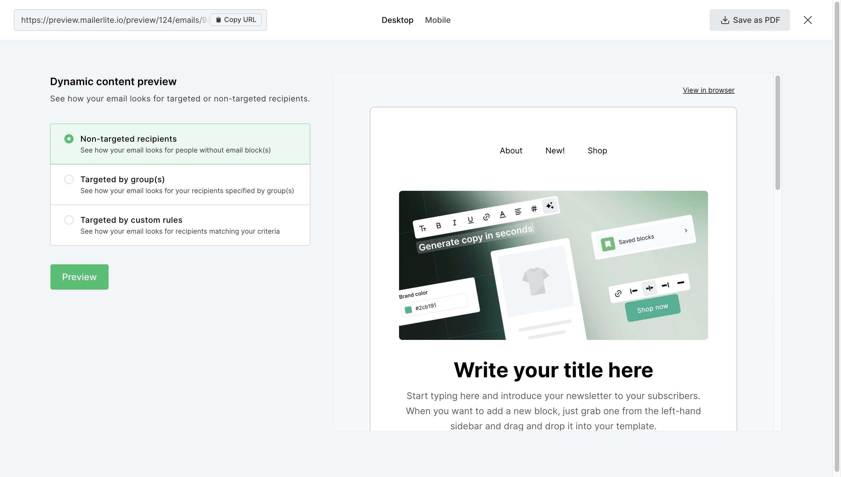 La vista previa por defecto (que no está orientado a un grupo específico) muestra el correo electrónico sin el contenido orientado a un grupo objetivo. Cuando seleccionas un grupo objetivo, un grupo personalizado o un grupo excluido, la vista previa del newsletter cambia para mostrar lo que es visible para ellos.