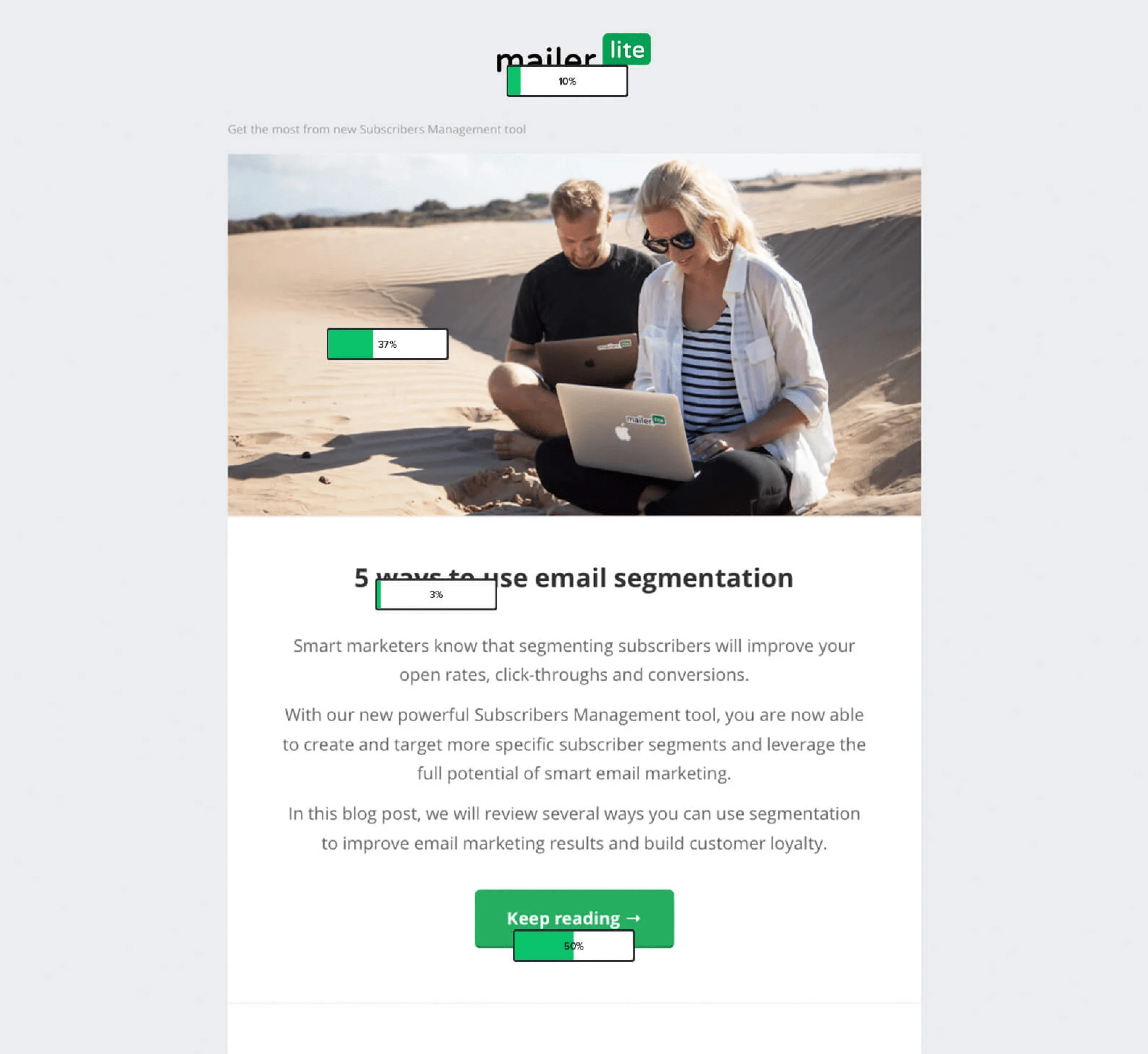 La segmentación del correo electrónico es la práctica de dividir tu lista de correo electrónico en diferentes grupos en función de intereses o datos demográficos. Mejora el CTR porque es más probable que la gente interactúe con campañas que son relevantes para sus intereses.