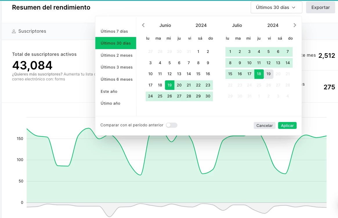 También puedes ver cualquier intervalo de fechas y luego acceder a informes comparativos para ver cómo han cambiado las métricas de tu campaña en un periodo determinado. Esto te permite ver el impacto exacto que tienen los cambios específicos en tu estrategia.