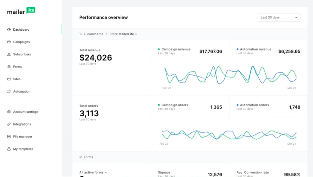 En MailerLite, puedes encontrar tus tasas de conversión de formularios individuales en las páginas Formularios y Sitios. Haciendo un seguimiento de las tasas de conversión de varios formularios, puedes ver los tipos de contenido y ofertas a los que responde tu público.