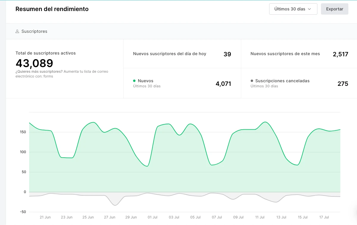 El total de suscriptores activos es el número de suscriptores de tu lista, excluyendo los que han enviado denuncias de spam, las bajas, los rebotes y los suscriptores eliminados. Esta métrica te indica si tus estrategias de captación de suscriptores están funcionando.