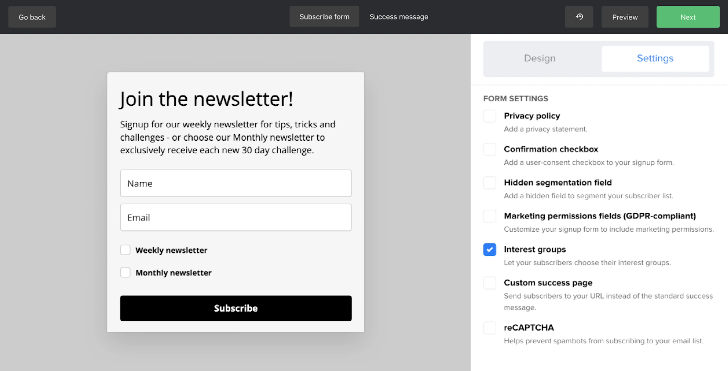 Utiliza grupos de interés en formularios para segmentar a los nuevos suscriptores, de modo que puedas enviarles contenido relevante del que es poco probable que se den de baja.