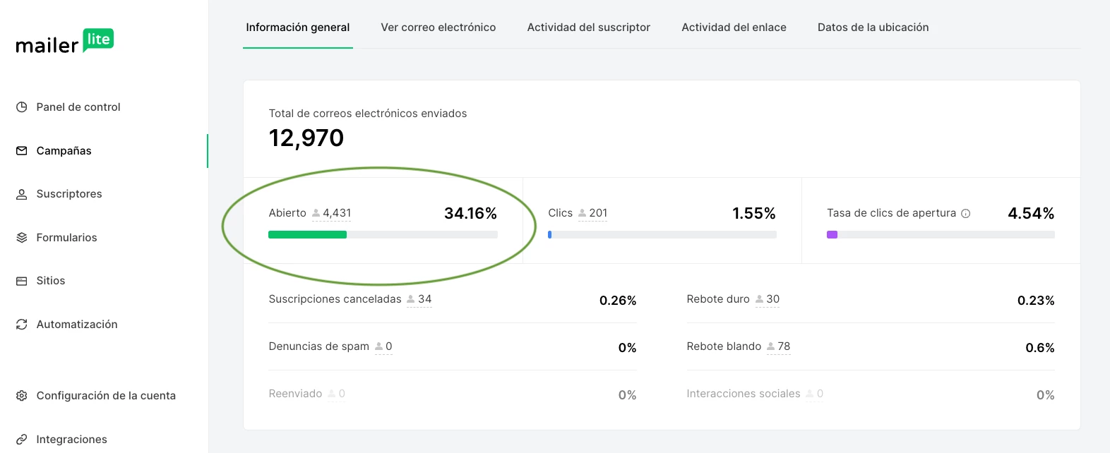 Si utilizas MailerLite, puedes encontrar las tasas de rebote individuales de una campaña en tu informe de campaña.