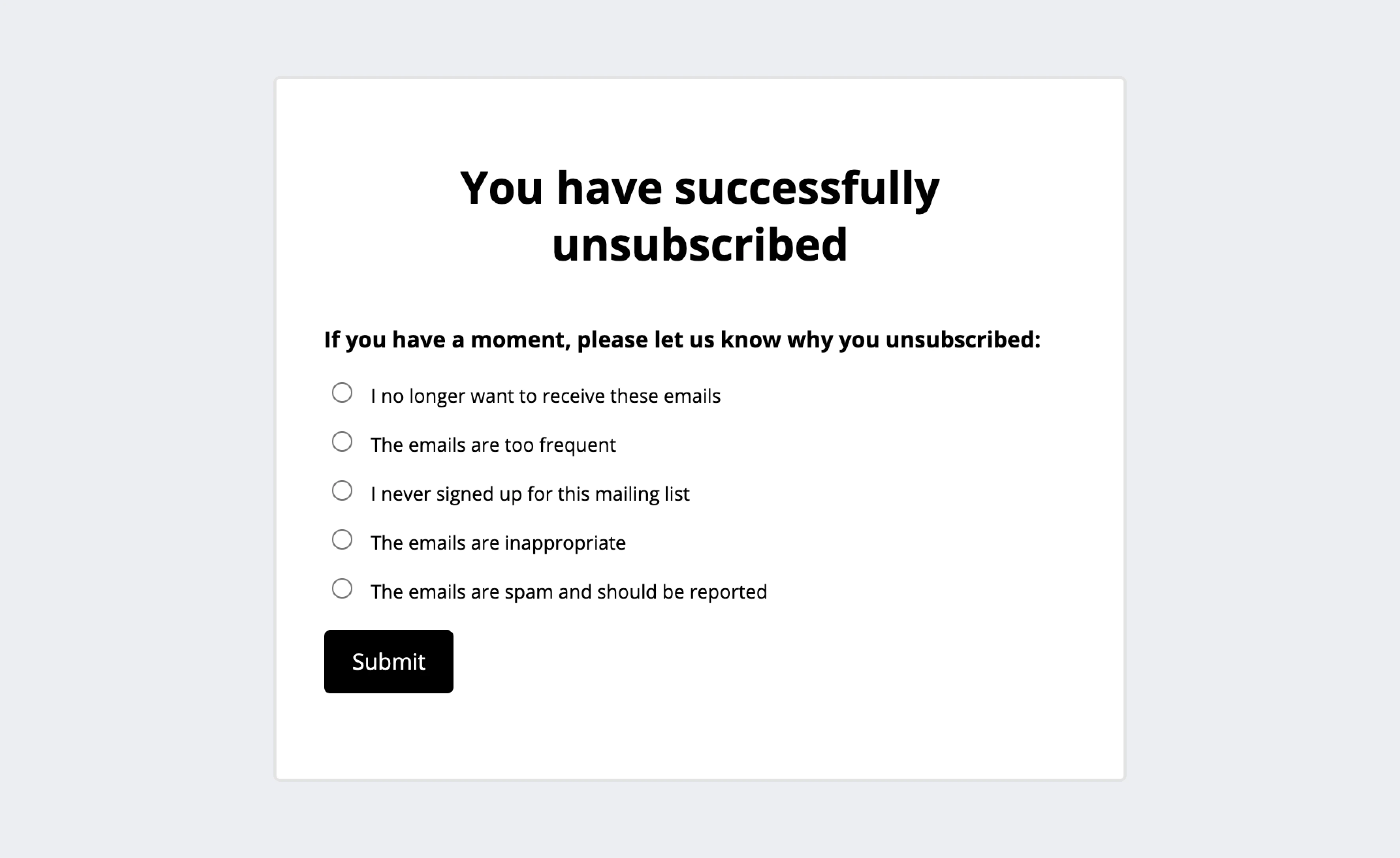 Utiliza las bajas para averiguar por qué tus suscriptores se van y cómo solucionarlo. Todas las páginas para darse de baja de MailerLite vienen con una encuesta incorporada para este fin.