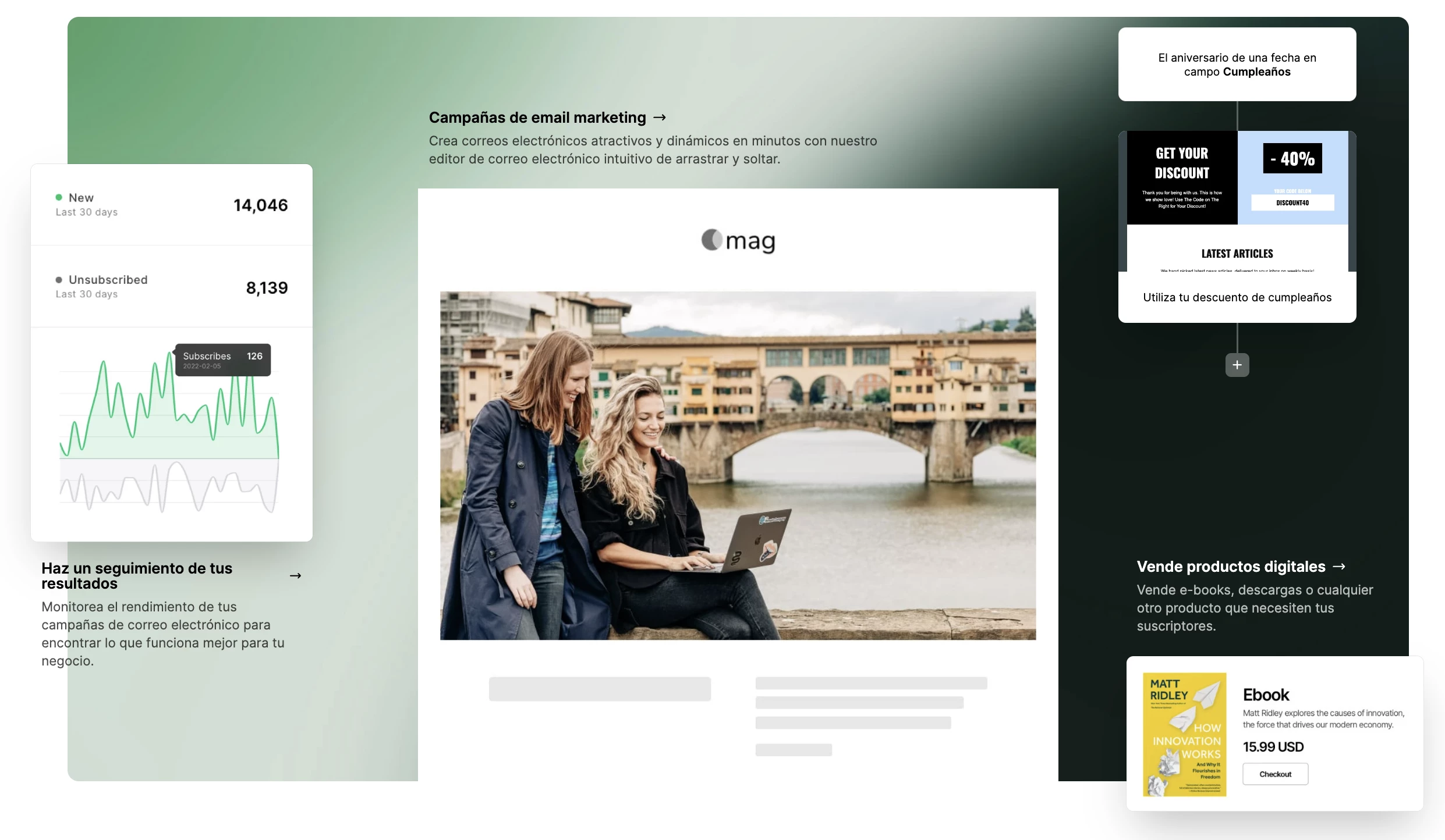 Y si alguna vez decides escalar e invertir algo de dinero, añadir una tienda online o lanzar campañas de email marketing, ya lo tienes todo integrado desde el mismo panel.