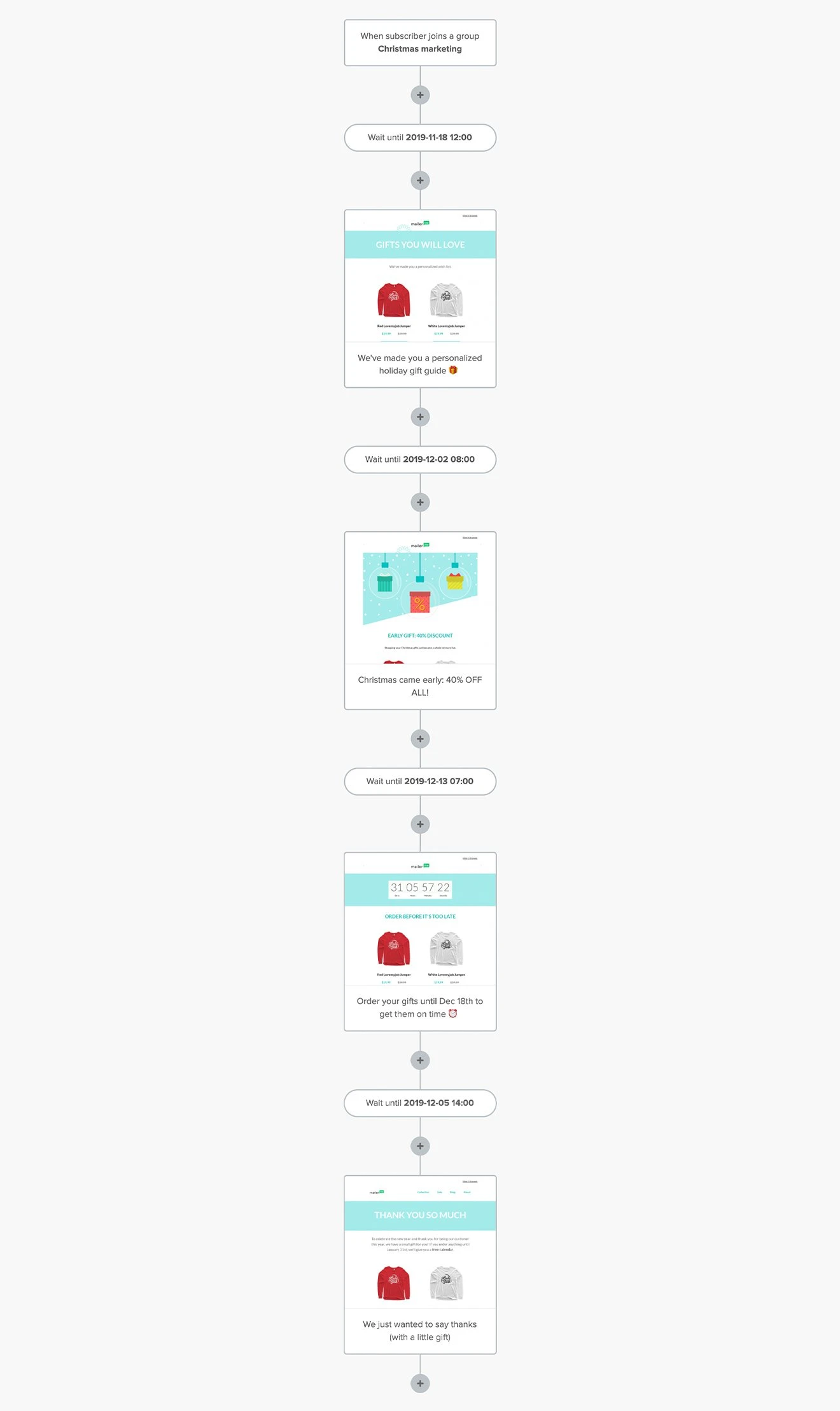 Usa herramientas visuales y la automatización de MailerLite para diseñar secuencias post-navidad y retener a los nuevos clientes adquiridos. Convierte a los compradores únicos en clientes de todo el año.