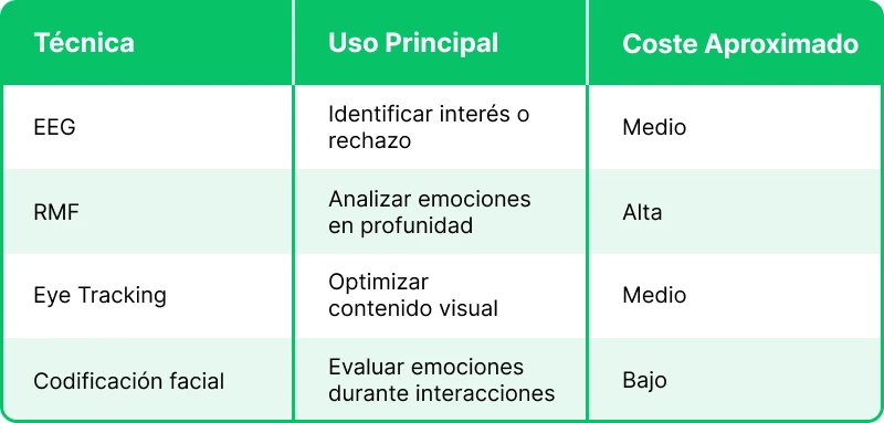 Herramientas como mapas de calor o tests A/B dan señales prácticas; si el presupuesto lo permite, EEG/eye-tracking añaden precisión.