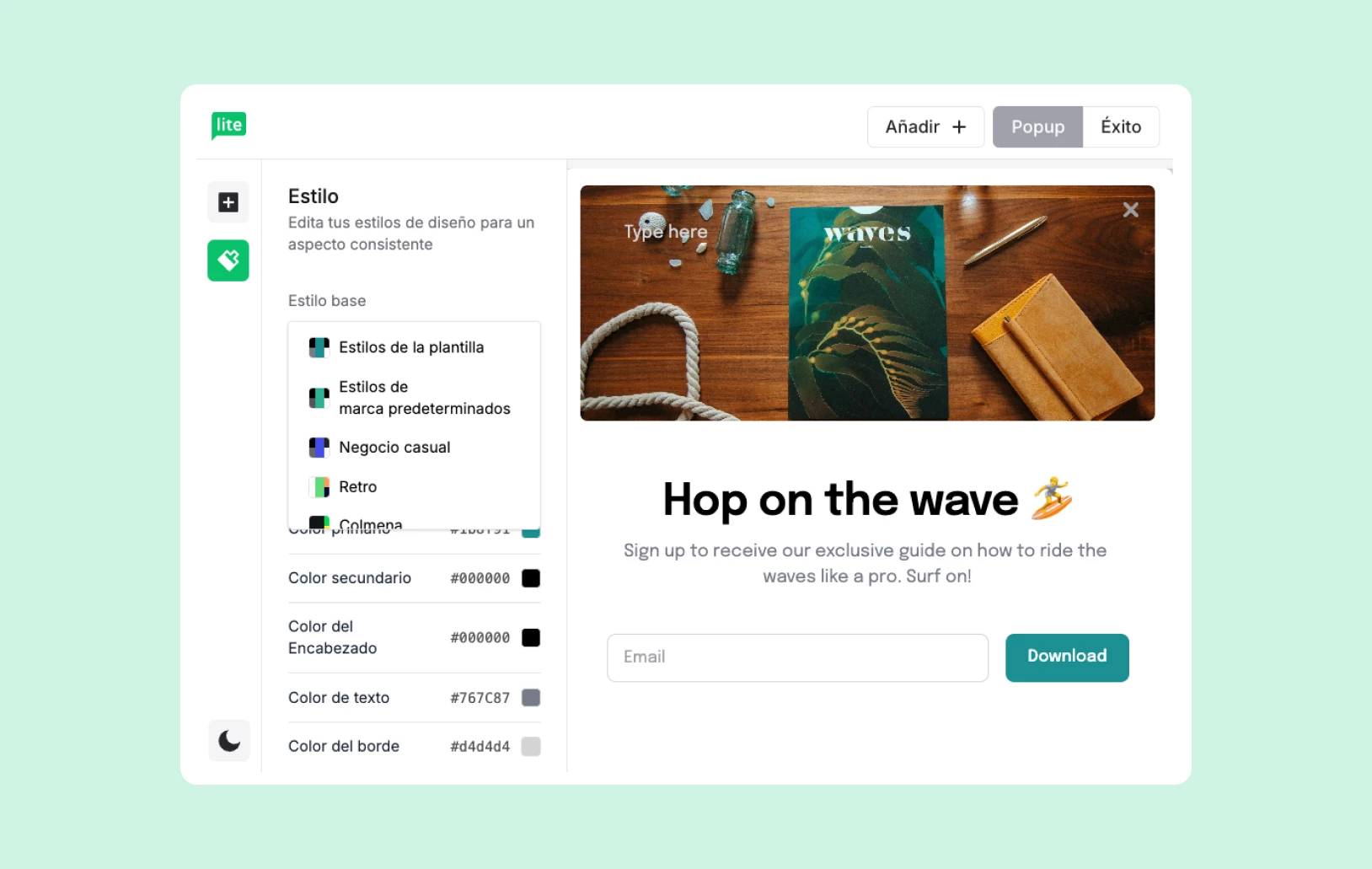 También hemos incorporado una función de estilo de marca para que tus ventanas pop-up estén alineadas a tu marca. Sólo tienes que crear un estilo de marca en la configuración de MailerLite y elegirlo en el menú de estilos. Cambiaremos automáticamente todos los elementos para adaptarlos a la configuración que hayas elegido.